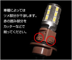 ※差込口の切り口(赤斜線部)の形状や車種により異なりますので、合わない場合はバルブ側ソケットの干渉部をカット又は削ってください。