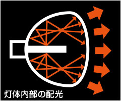 左記の図を見て頂いても分かる通り、点灯時に灯体のリフレクターを使用し配光。