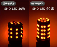 従来モデルは1つのバルブに各色30発づつの合計60発のLEDを搭載し、切替を行って追いましたが新しいタイプでは発光素子内に2色搭載することにより1色で60発点灯を実現しております。 この違いは一目瞭然の赤kるさとなって確かな満足感が得られます。