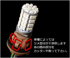 灯体側差込口ソケットは汎用タイプとなりますので、車種/取付場所によりソケット側のツメをカット又は削る等の加工が必要となる場合がございます。 差込口ソケットは一般的な丸型に対応となります。 ※三角形/おにぎり型には取付不可となります。 ※差込口の切り口(赤斜線部)の形状や車種により異なりますので、合わない場合はバルブ側ソケットの干渉部をカット又は削ってください。