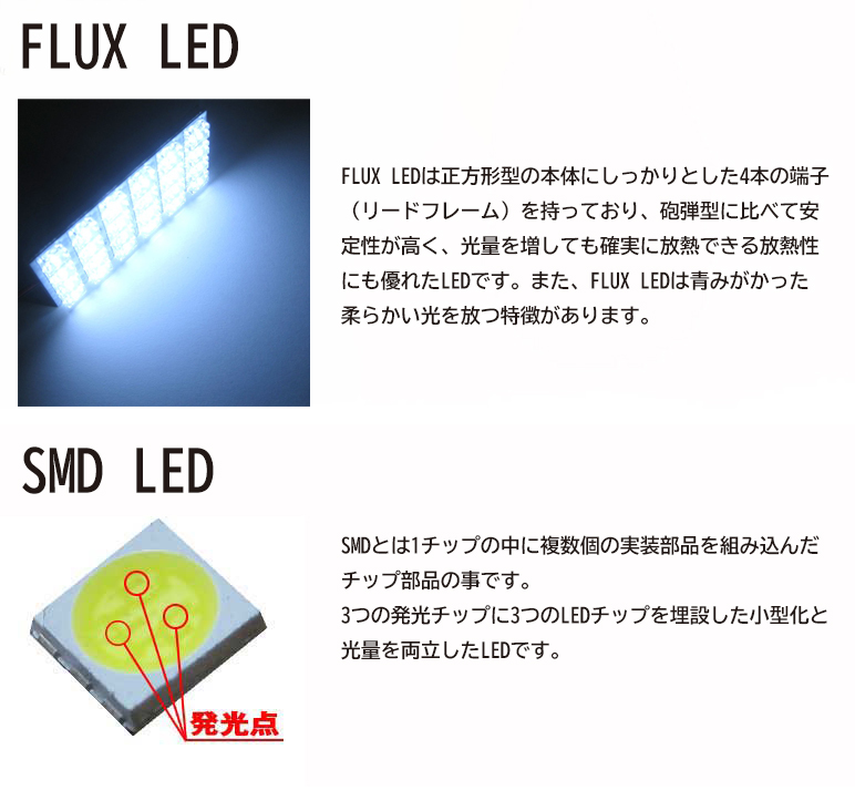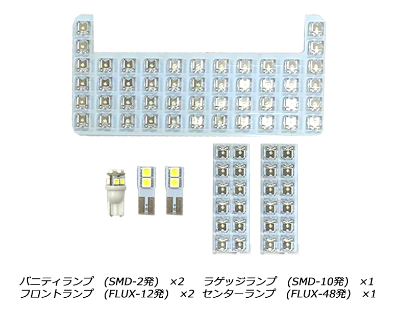 | セット内容 | バニティランプ (SMD-2発) ×2 ラゲッジランプ (SMD-10発) ×1 フロントランプ (FLUX-12発) ×2 センターランプ (FLUX-48発) ×1 |