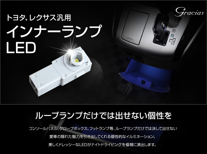 トヨタ車種汎用タイプのインナーランプなのでプリウス、アルファード、ヴェルファイア等の人気車種をはじめ、トヨタ・レクサスの幅広い車種をカバーしています。 取付場所もフットランプ、グローブボックス、コンソール等、豊かなバリエーションを実現しました。