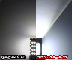 従来の高輝度とされていたSMD-LED60発との照射比較を見れば、その明るさと照射距離等の違いが一目瞭然でお分かりいただけるかと思います。根本的な構造の違いにより成し得た結果です。